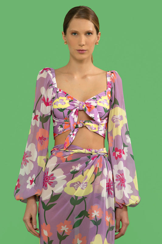 TOP BIQUÍNI MANGA LONGA RETRÔ FLOWER LILAS