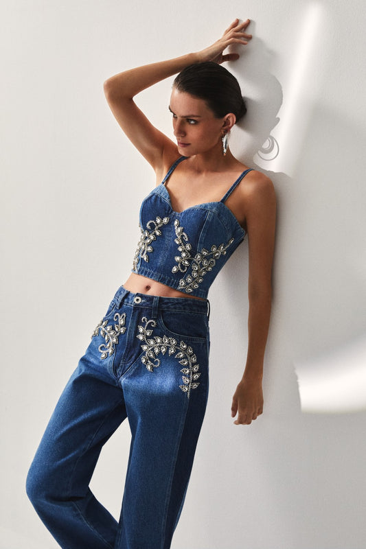 EsgotadoTOP CROPPED DENIM SWAROVSKI JEANS