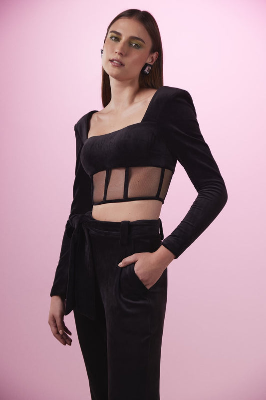TOP CROPPED RECORTES TULE VELUDO BABYLON PRETO