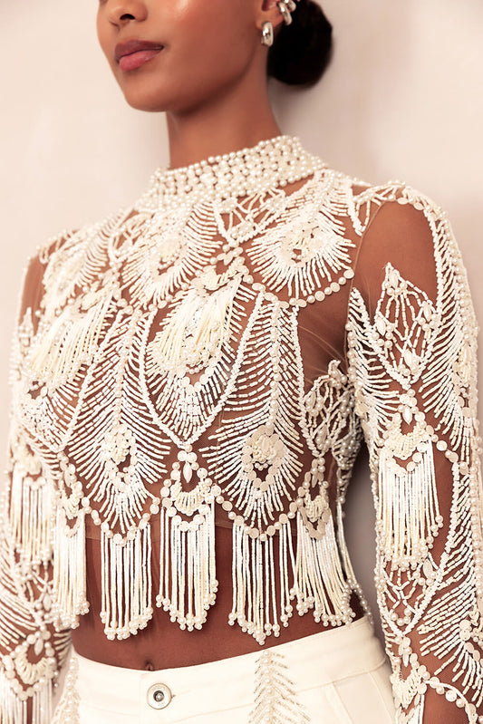 TOP CROPPED TELA RICHILIEU PEARL GLAM OFF WHITE