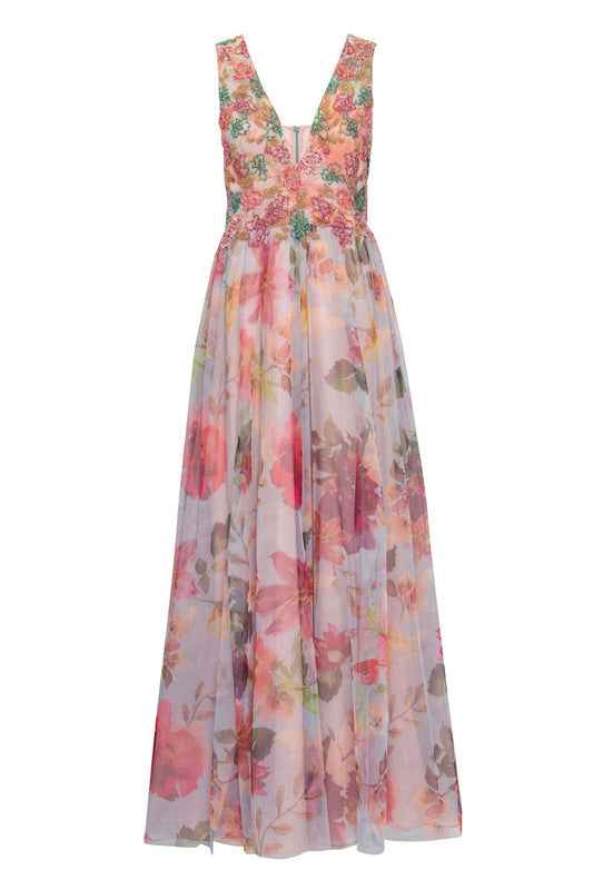VESTIDO BUSTO BORDADO SAIA ESTAMPADA AZUL