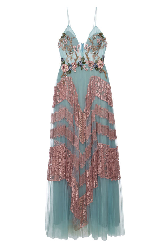 VESTIDO BUSTO BORDADO SAIA BICOLOR RENDA AZUL