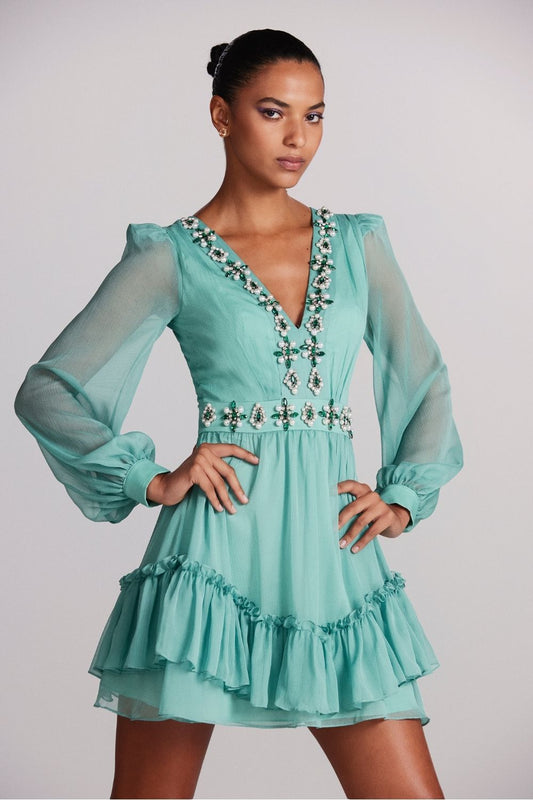 VESTIDO CURTO BORDADO MANGA LONGA SILKY STARDUST VERDE
