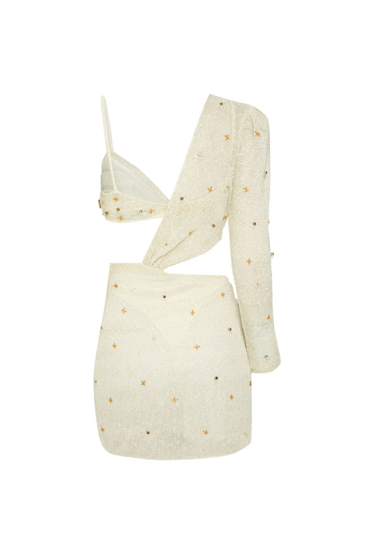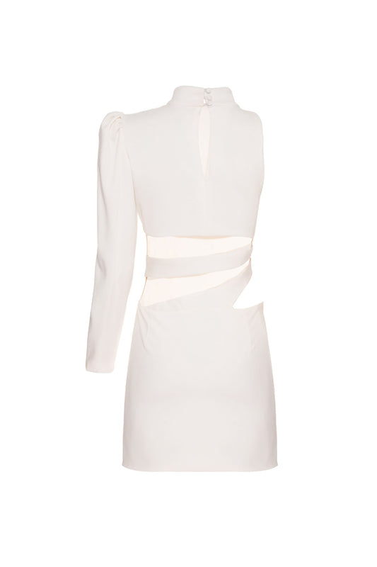 VESTIDO CURTO MANGA ÚNICA CREPE CRYSTAL OFF WHITE