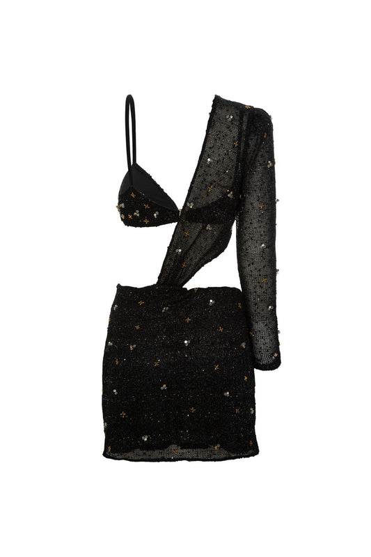 VESTIDO CURTO MANGA ÚNICA CREPE CRYSTAL PRETO