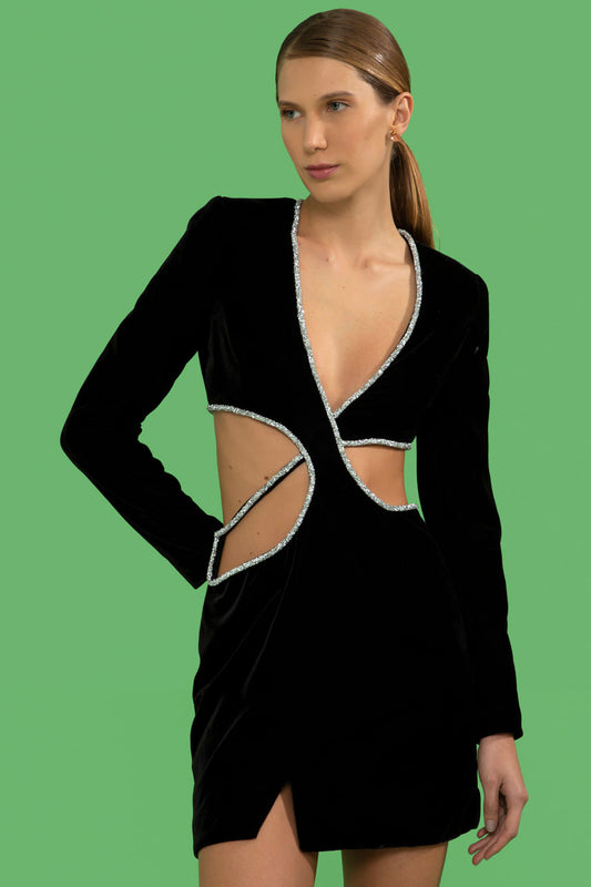 VESTIDO CURTO RECORTES VELUDO CRYSTAL PRETO
