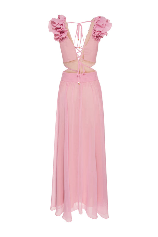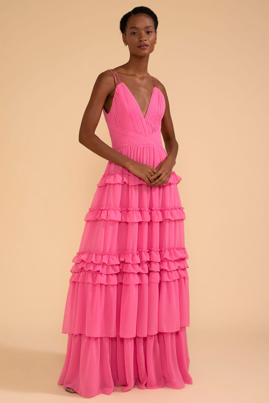VESTIDO LONGO ALÇA STRASS CHIFFON ÍRIS ROSA