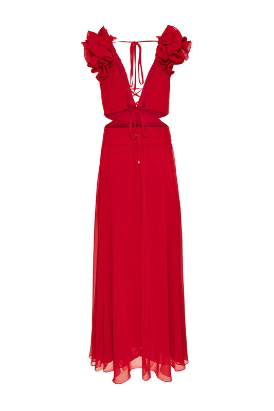 VESTIDO LONGO ALÇA BABADOS WIND FLOWER VERMELHO