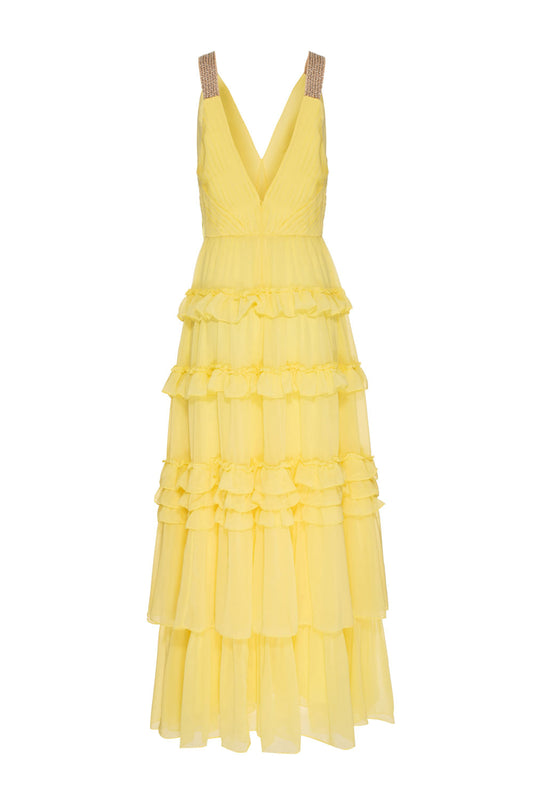 VESTIDO LONGO ALÇA STRASS CHIFFON ÍRIS AMARELO