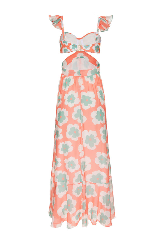 VESTIDO LONGO ALÇA BABADOS WIND FLOWER CORAL