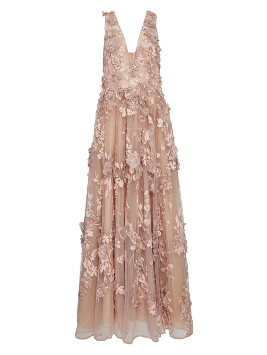 VESTIDO LONGO APLICAÇÃO FLORES ROSA