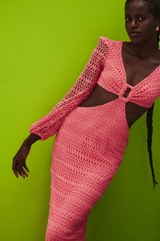 VESTIDO LONGO ARGOLA TELA NEON VIBES CORAL