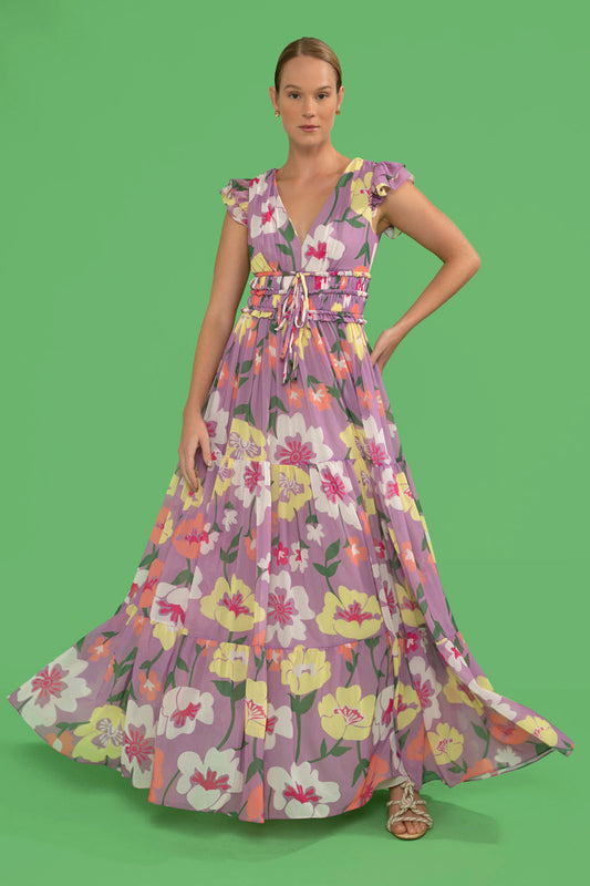 VESTIDO LONGO AMARRAÇÃO RETRÔ FLOWER LILAS