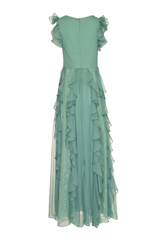 VESTIDO LONGO BABADOS RENDA SILKY STARDUST VERDE