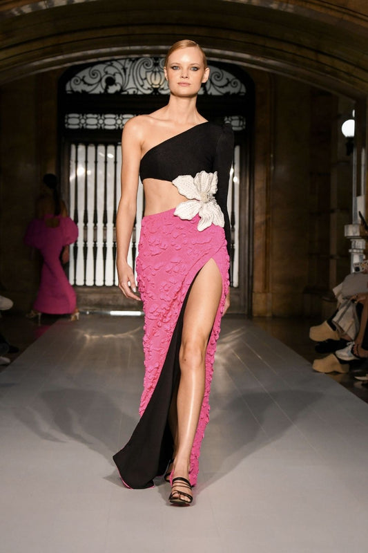 VESTIDO LONGO BICOLOR OMBRO ÚNICO SILKY STARDUST ROSA E PINK