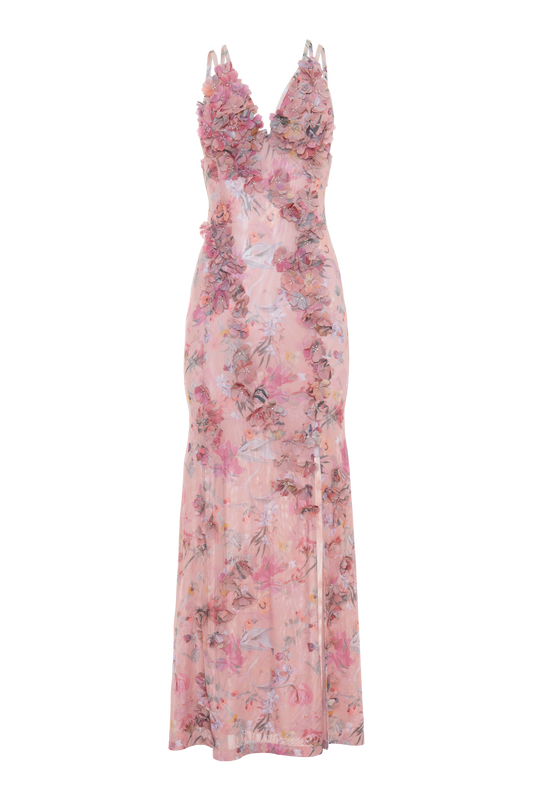 VESTIDO LONGO BUSTO RECORTE TRANSPARÊNCIA ROSA