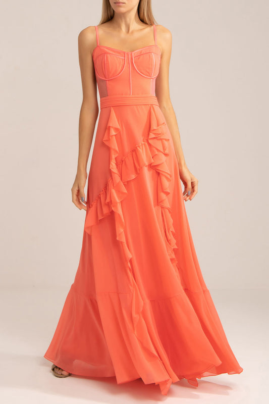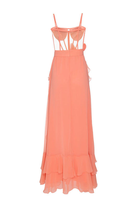 VESTIDO LONGO CORSET CHIFFON BLOOMING CORAL