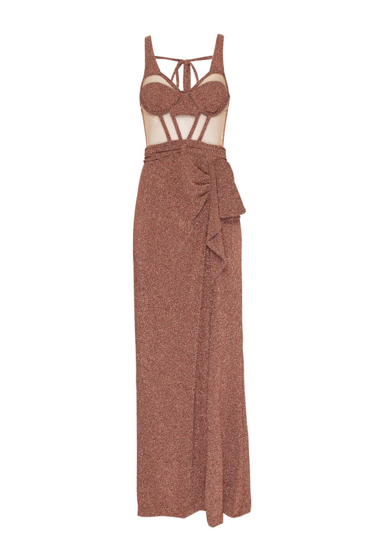 VESTIDO LONGO CORSET LUREX BARDOT COBRE
