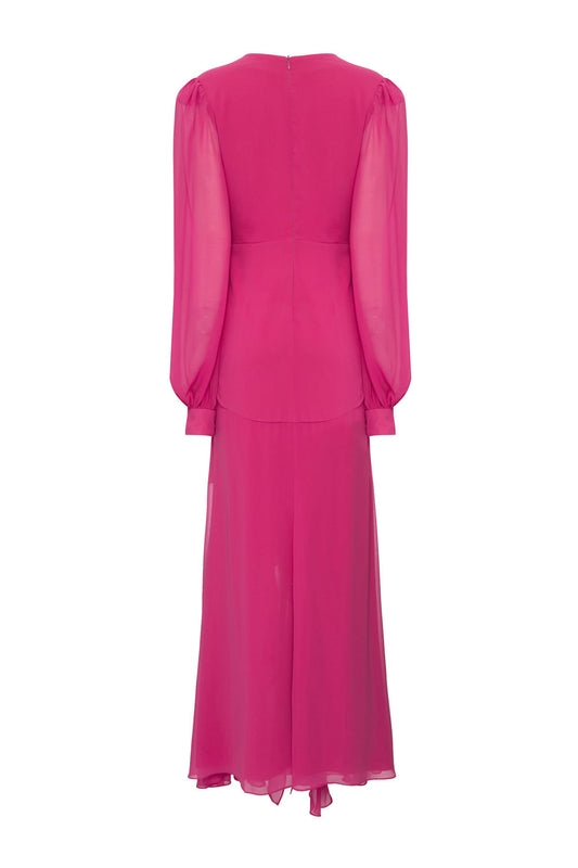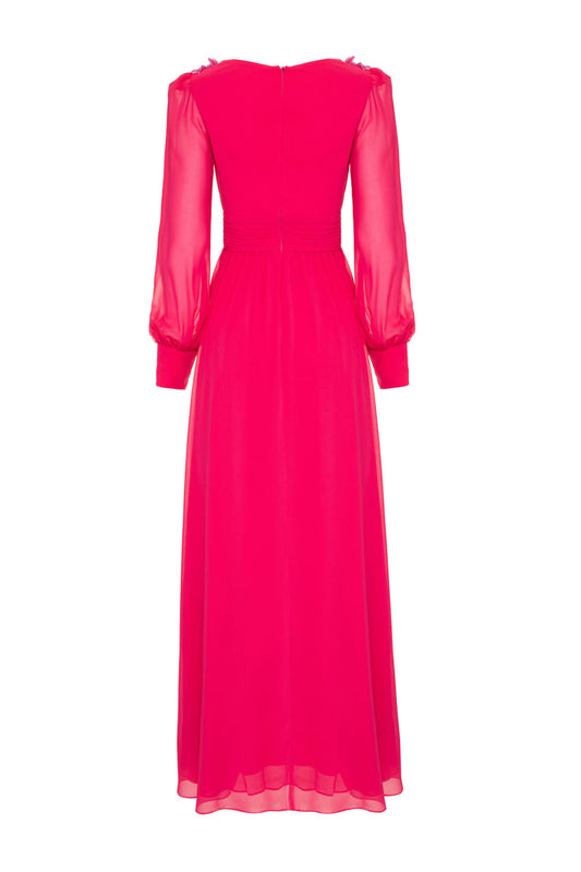 VESTIDO LONGO DECOTE PREGAS BORDADO CHIFFON ÍRIS PINK