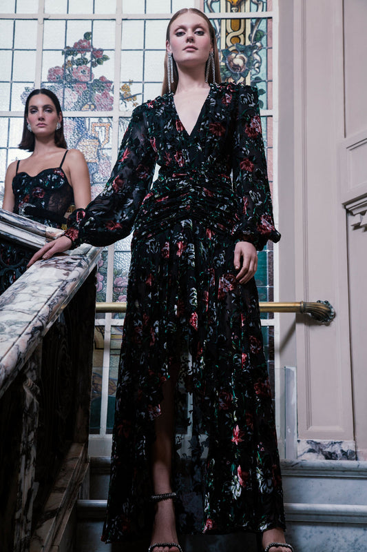 VESTIDO LONGO DRAPEADO VELUDO FLORAL PRETO