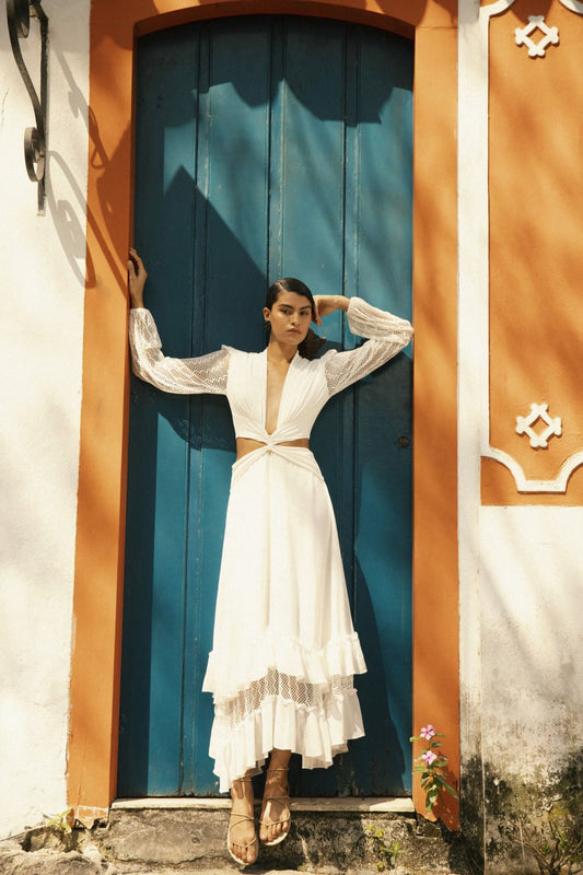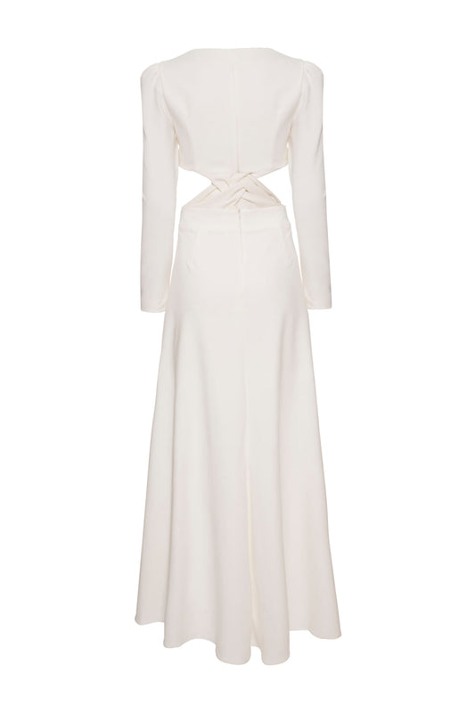 VESTIDO LONGO DECOTE TRANÇADO CREPE CHAIN OFF WHITE