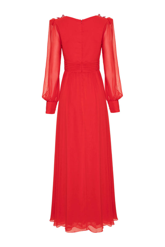 VESTIDO LONGO DECOTE PREGAS BORDADO CHIFFON ÍRIS VERMELHO