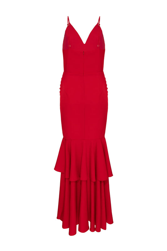 VESTIDO LONGO FENDA FRONTAL BABADO VERMELHO