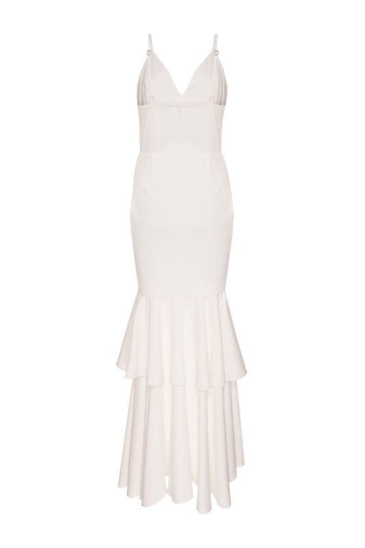 VESTIDO LONGO FENDA FRONTAL BABADO BRANCO