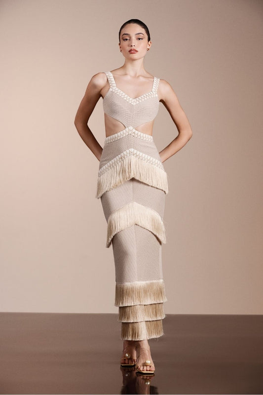 VESTIDO LONGO FRANJAS MALHA EMILLE CRU