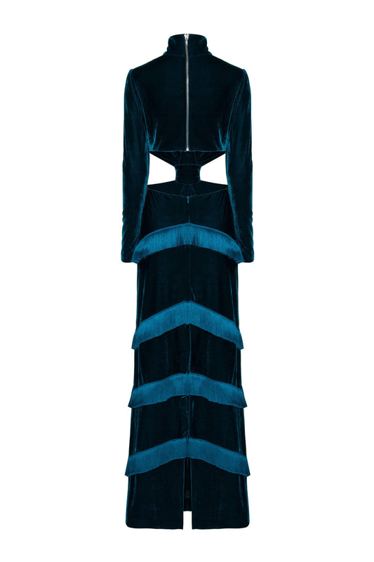 VESTIDO LONGO FRANJAS VELUDO EVE AZUL