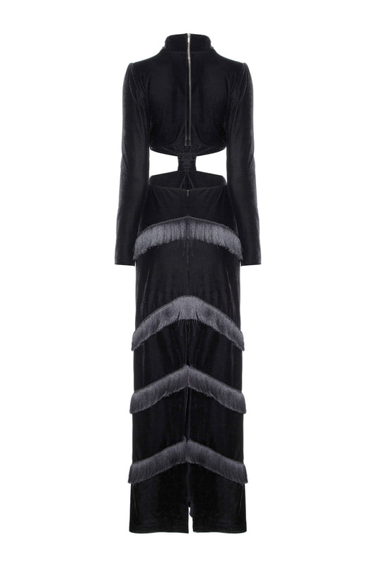 VESTIDO LONGO FRANJAS VELUDO EVE PRETO