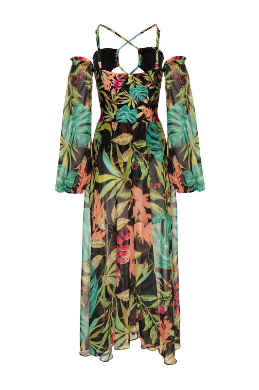 VESTIDO LONGO FRANZIDO TROPICÁLIA PRETO