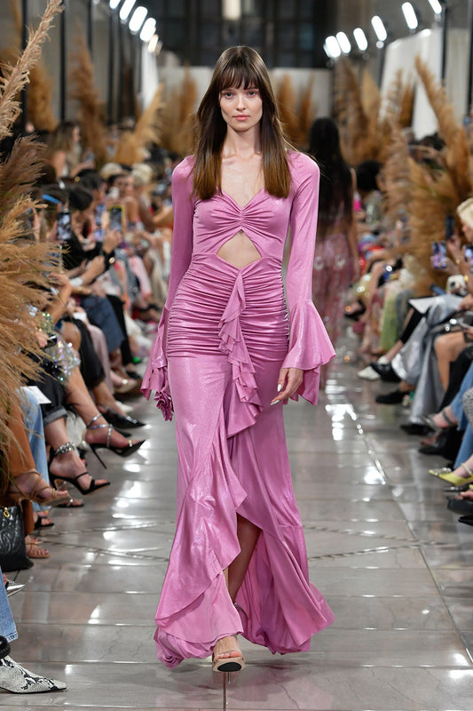 VESTIDO LONGO LAMÊ SAIA FRANZIDA ROSA