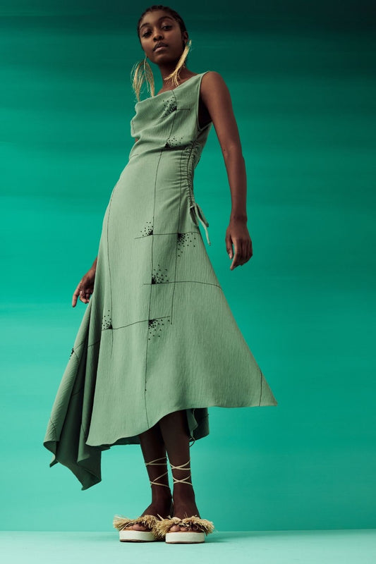VESTIDO MÍDI ASSIMÉTRICO DECOTE DEGAGÊ - AP03 GREEN