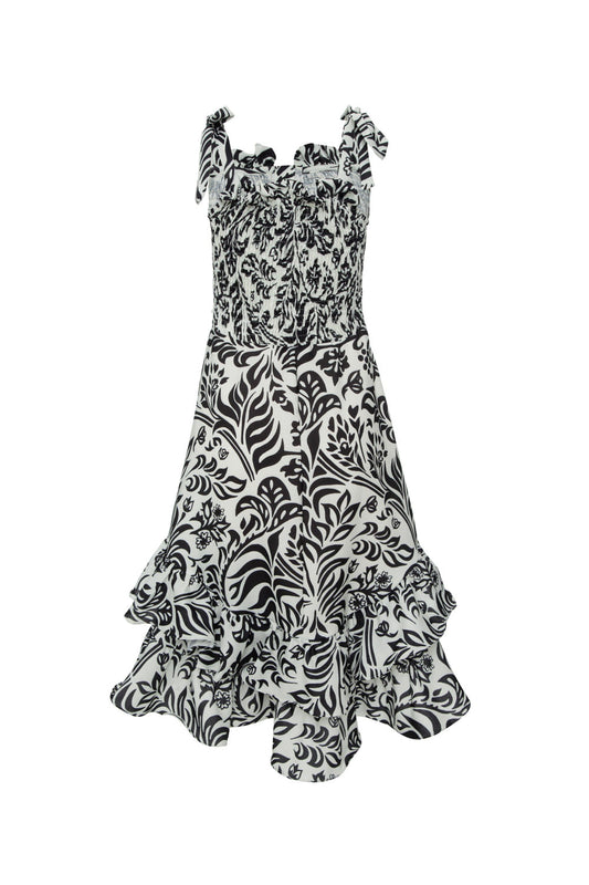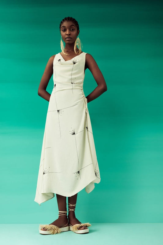 VESTIDO MÍDI ASSIMÉTRICO TROPICAL GRÁFICO OFF WHITE