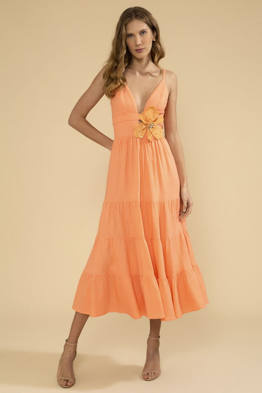 VESTIDO MÍDI FLOR LINHO BALNEÁRIO CORAL