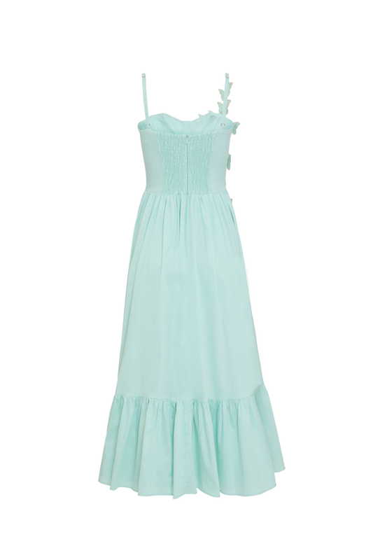 VESTIDO MÍDI FIVELA CETIM MEMORY LEAVES AZUL