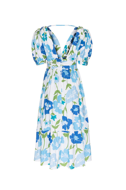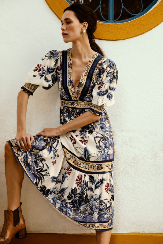 VESTIDO MÍDI FRENTE ÚNICA VINTAGE JACQUARD AZUL COM OFF