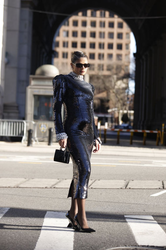 VESTIDO MÍDI GOLA ALTA PAETÊ VIBRANT PRETO