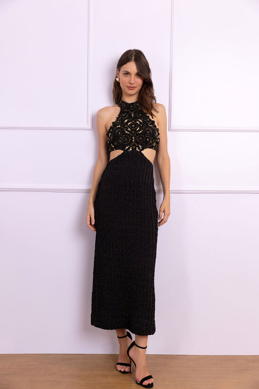 VESTIDO MÍDI JACQUARD VINTAGE LUREX PRETO