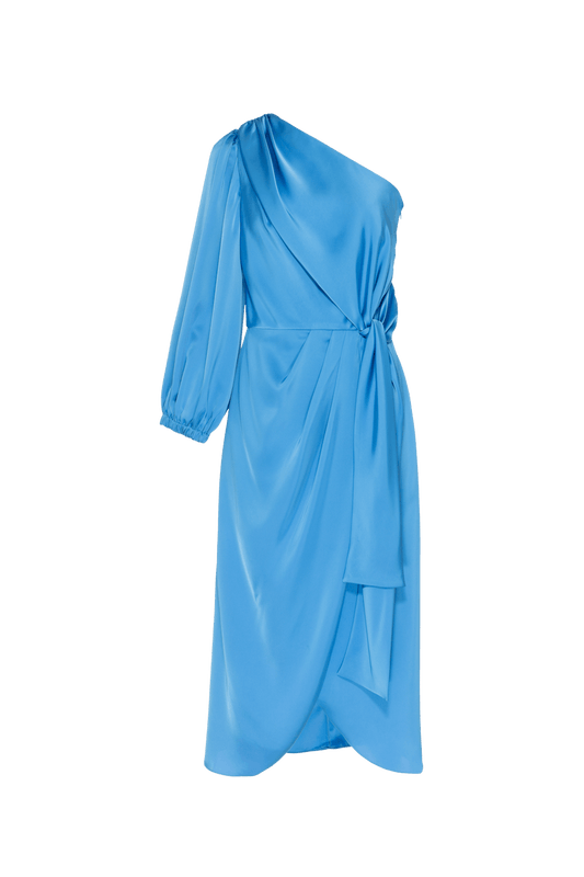 VESTIDO MÍDI MANGA ÚNICA CETIM MONALISA CELESTE