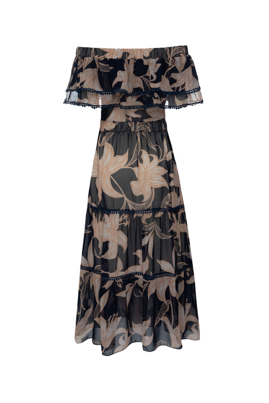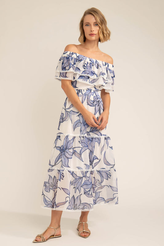 VESTIDO MÍDI OMBRO A OMBRO RETRÔ FLOWER OFF WHITE