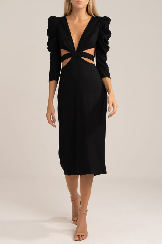 VESTIDO MÍDI RECORTES LOYAL CREPE PRETO