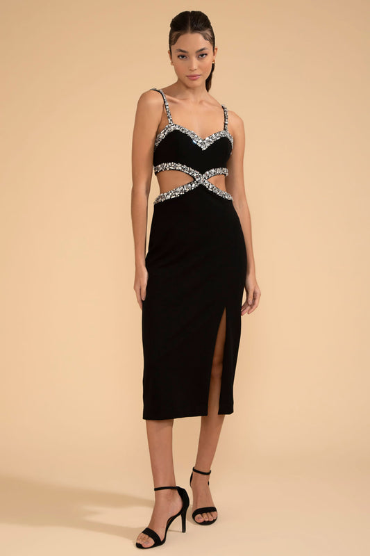 VESTIDO MÍDI RECORTES PEDRARIA CREPE CRYSTAL PRETO
