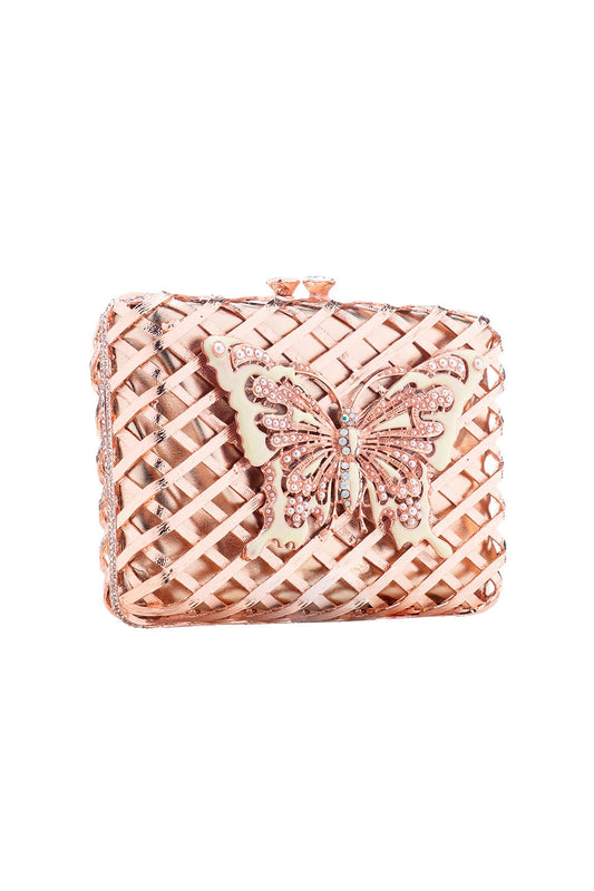 BOLSA CLUTCH METAL TRAMA BORBOLETA CRISTAIS ROSE