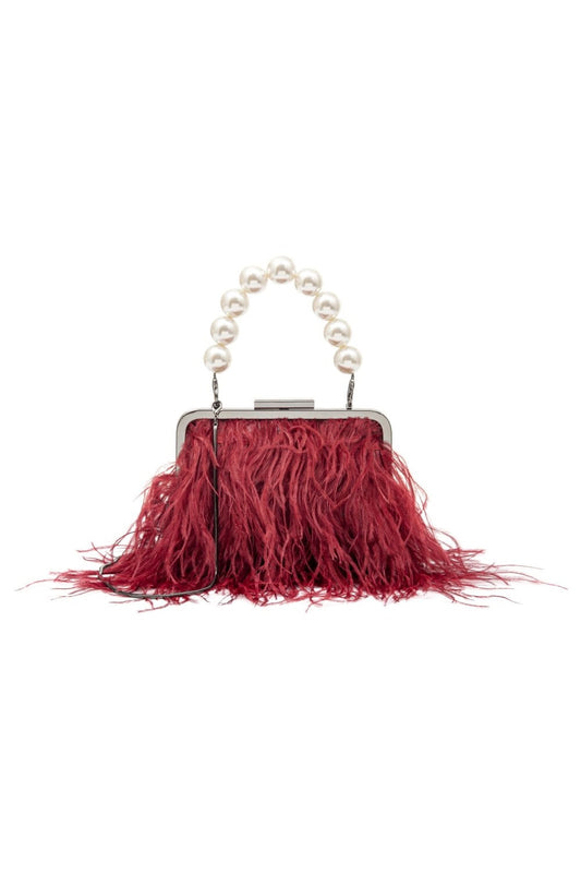 BOLSA CLUTCH PLUMAS COM PÉROLAS VERMELHO
