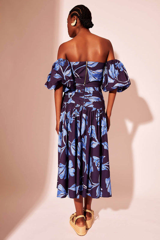 SAIA MÍDI PREGAS SUZY FLOWER AZUL MARINHO
