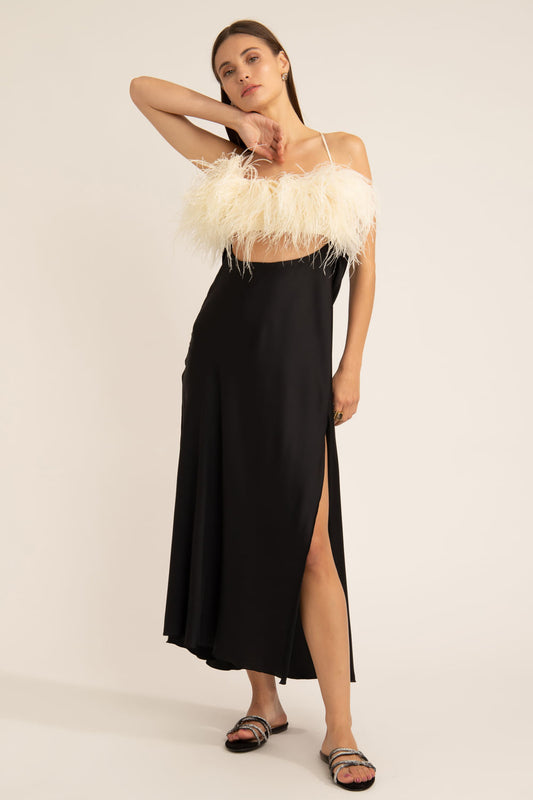 EsgotadoSLIP DRESS CLASSY FEATHERS PRETO