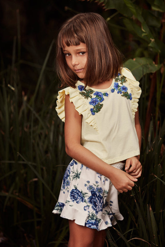T-SHIRT INFANTIL BORDADA BABADO AMARELO