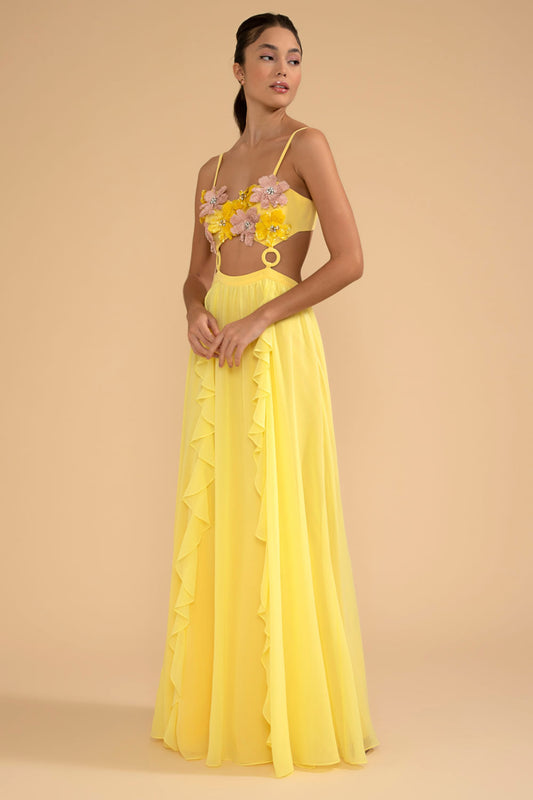 VESTIDO LONGO BUSTO FLOR CHIFFON ÍRIS AMARELO